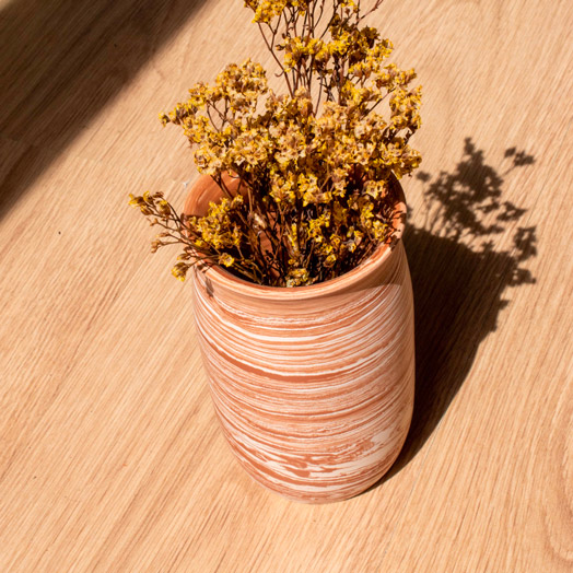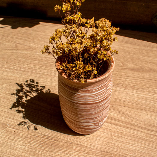 Jarrón ideal para flores secas, hecho al torno utilizando una mezcla de barro rojo y blanco. Cocida 2 veces, primero a 950ºC i después a 1050ºC para el esmalte brillante interior.