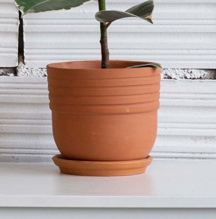 Maceta de terracota con textura rallada, hecha con molde y en una sola cocción de 950ºC. Ideal para plantas medianas.Tiene agujero de drenaje en la base para que la planta no se ahogue.